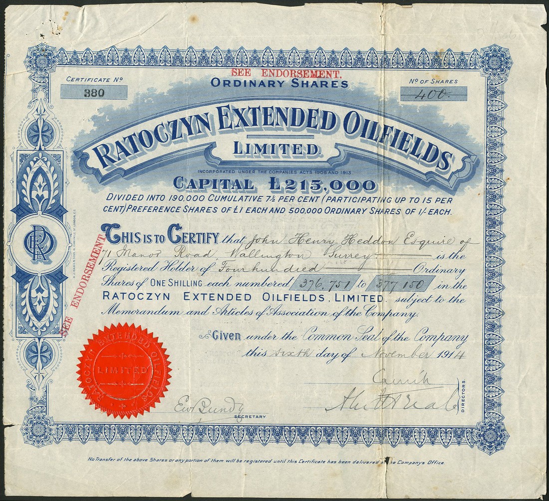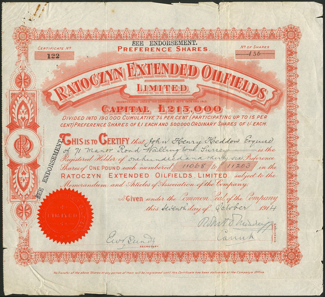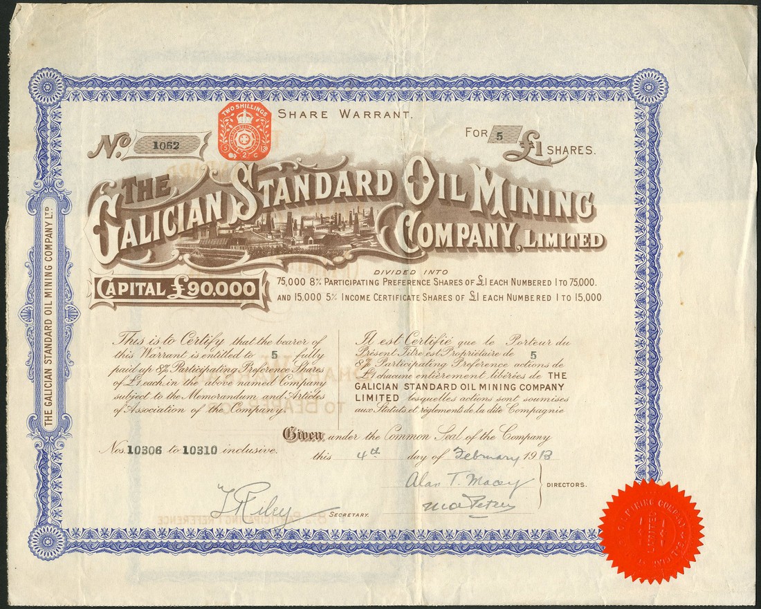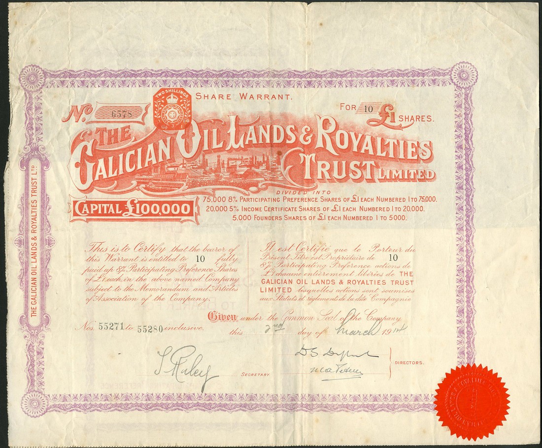 Galican Standard Oil Mining Co. Ltd., 8% participating preference shares of £1 each, 19[13], no.1062, and Galican Oil Lands & Royalties Trust Ltd., 8% participating preference shares of £1 each, 19[14], no.6578, both with oilfield and refinery scene within title, ornate border, brown and blue, and red and purple respectively, together with Ratoczyn Extended Oilfields Ltd., 1 shilling ordinary shares, and £1 7% preference shares, both 191[4], blue and red respectively, some creasing, the latter two with small tears, fine to very fine. (4)