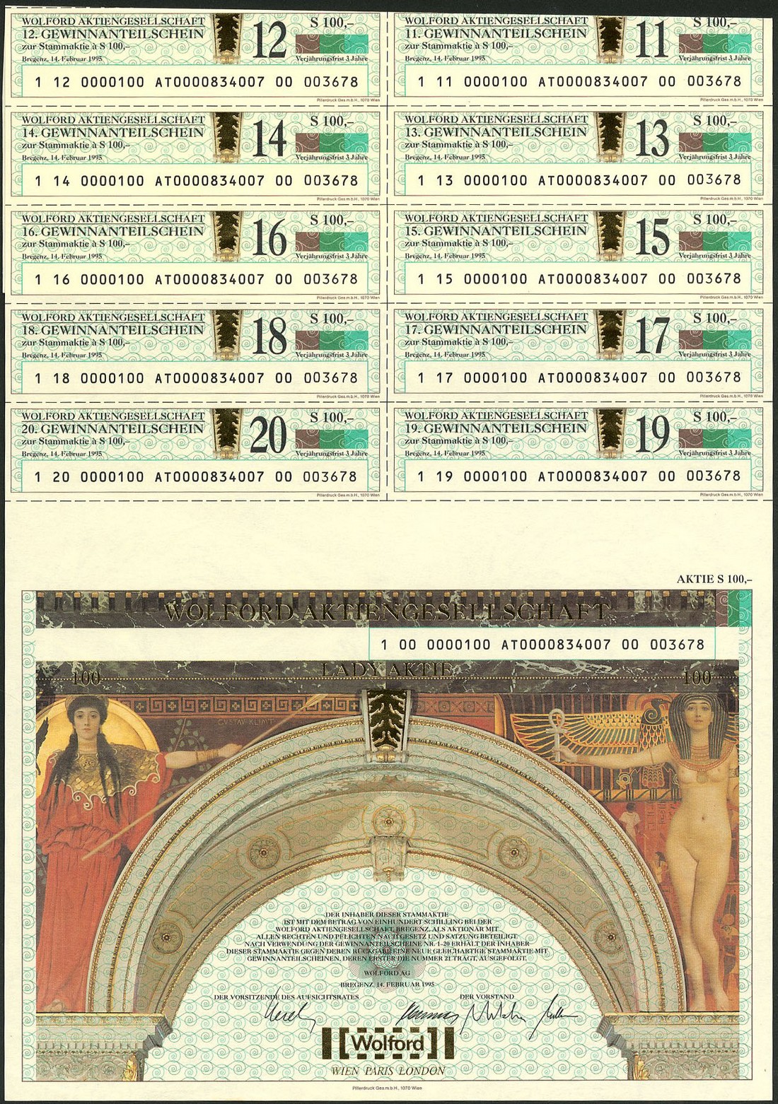 Wolford Aktiengesellschaft, 100 schilling share, 1995, no.3678, full colour and gold printed vignette of painting with figures of Greek Goddess Athene and Egyptian Goddess, originally by Gustav Klimt, with all coupons, extremely fine or better.