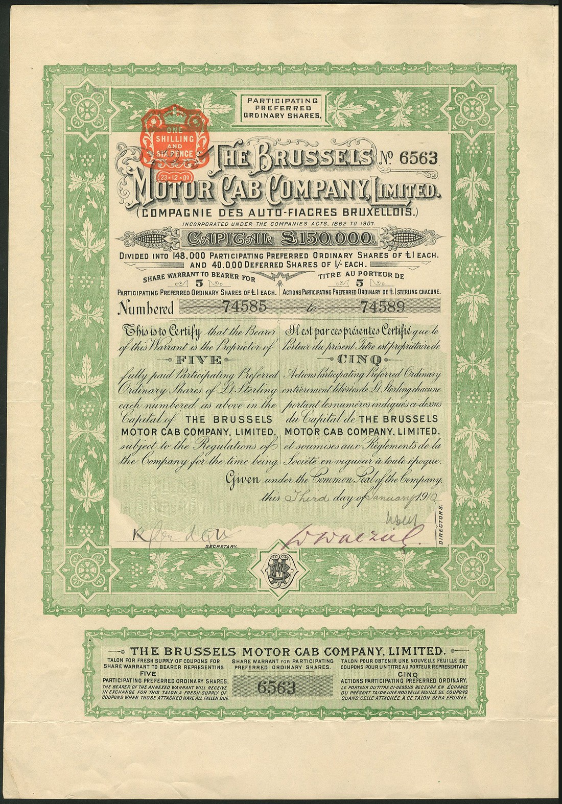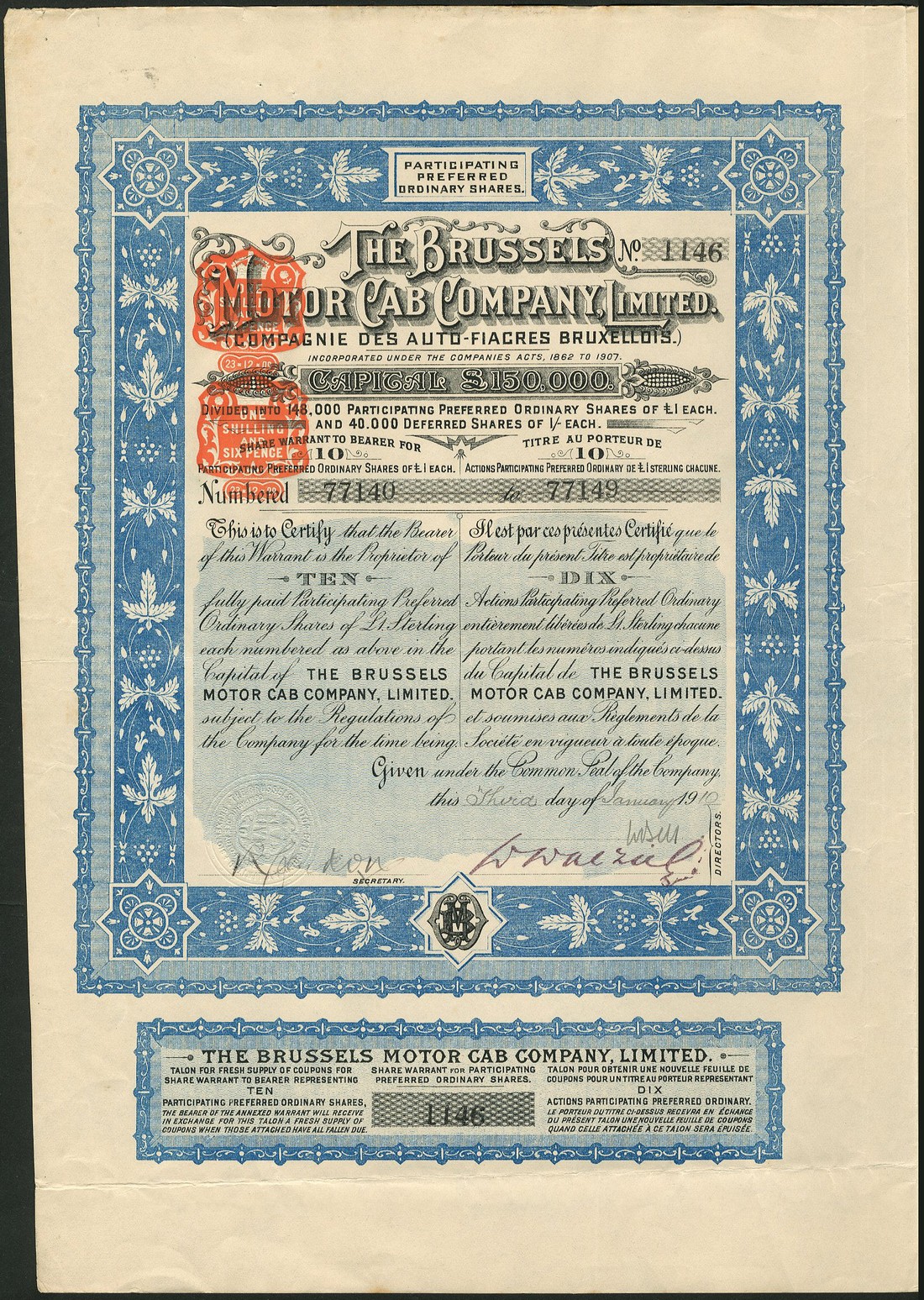 Brussels Motor Cab Co. Ltd., a pair of certificates for 5 and 10 participating preferred ordinary shares of £1, 19[10], no.6563 and no.1146, both with facsimile signature of Davison Dalziel, ornate border, blue and green respectively, both with coupons, good very fine. (2)