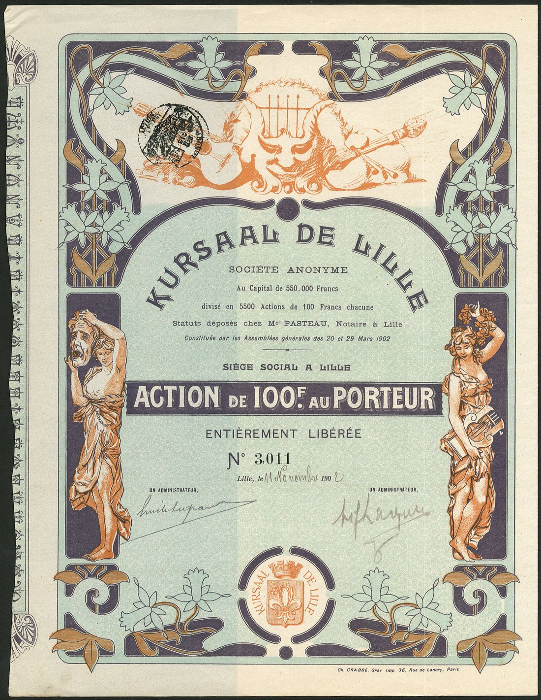 Kursaal de Lille S.A., 100 franc share, Lille 190[2], no.3011, colourful piece with allegorical females at each side, purple and tan with pale green underprint, with coupons, single vertical fold, otherwise good very fine.
