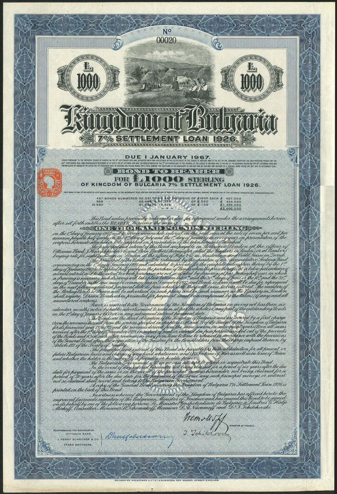 Kingdom of Bulgaria, 7% Settlement Loan, 1926, bond for £1000, no.00020, of only 467 issued, large format piece with vignette of peasants in field, ornate border, blue and black, printed by Bradbury, Wilkinson & Co., with coupons, extremely fine and rare.