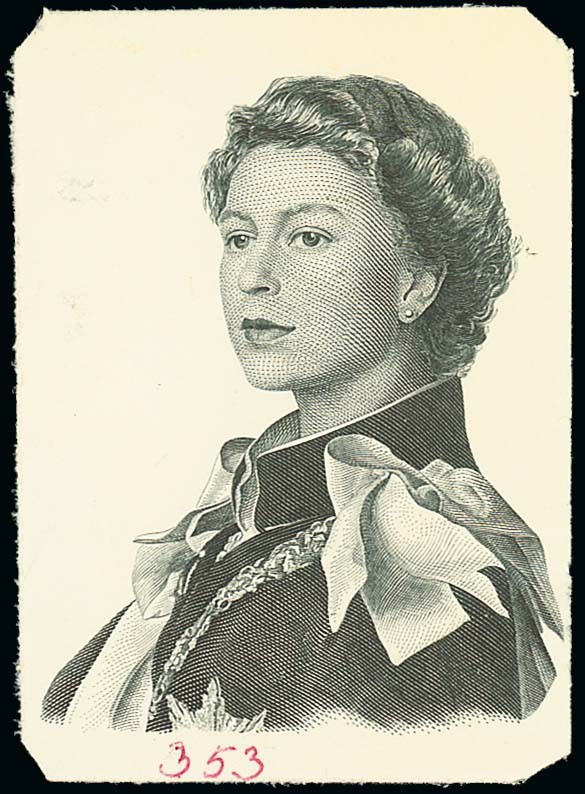 Large head and shoulders (after Annigoni), unframed (47mm x 65mm), die number "353" below in red mauscript, fine. Photo
