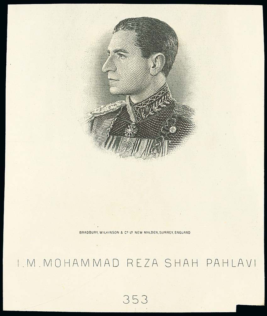 1942 (c.) Mohammed Reza Shah Pahlavi, large head and shoulders within unframed oval (69mm x 83mm), i. m. mohammad reza shah pahlavi" and die number "353 below; small part excised at foot otherwise fine. Photo