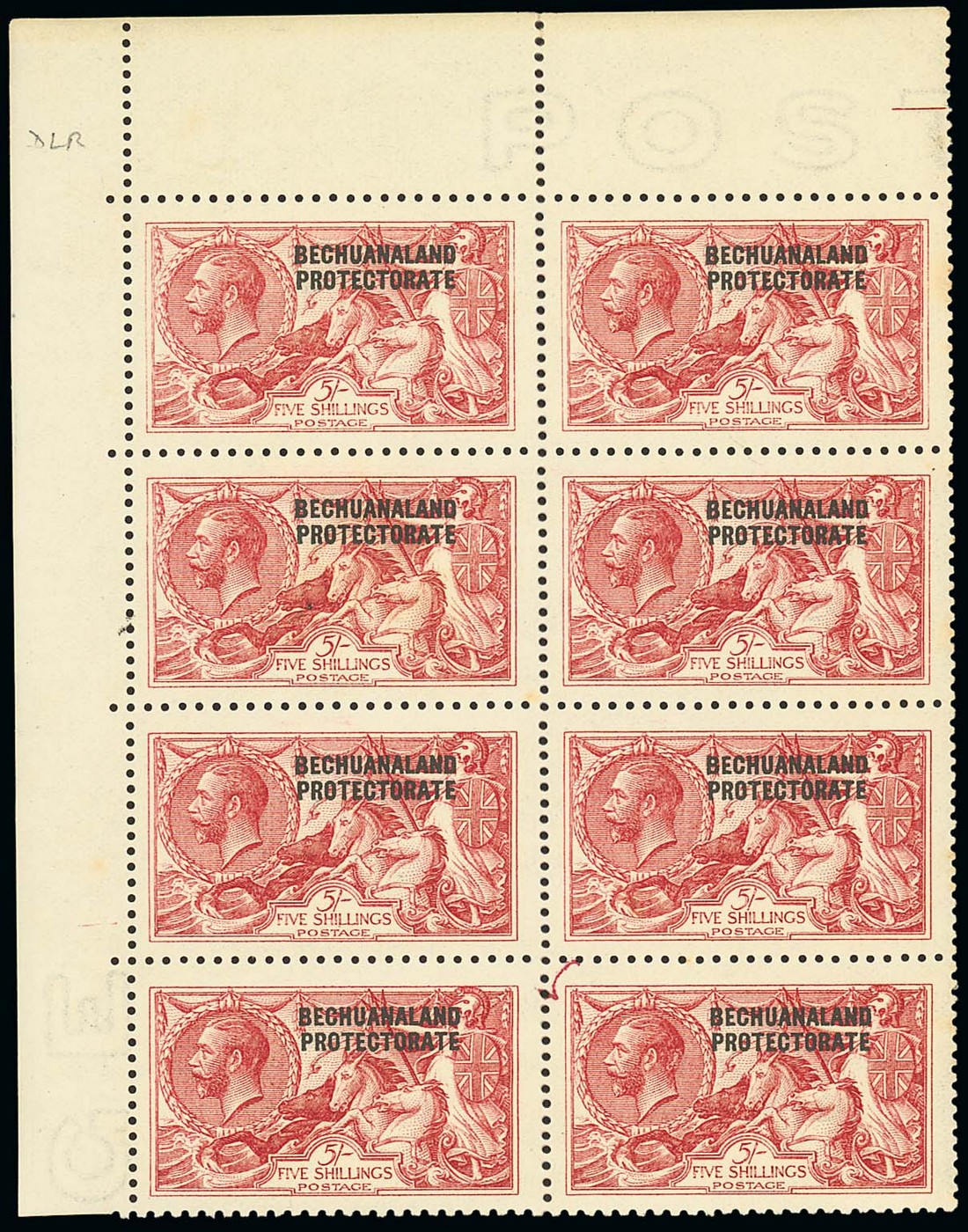 De La Rue 5/- bright carmine upper left corner block of eight (2x4) with the lower right stamp showing an inking flaw at upper left corner, unmounted mint; the upper right stamp with a small fox patch barely apparent on face. A spectacular multiple. S.G. 87, £2,400. Photo