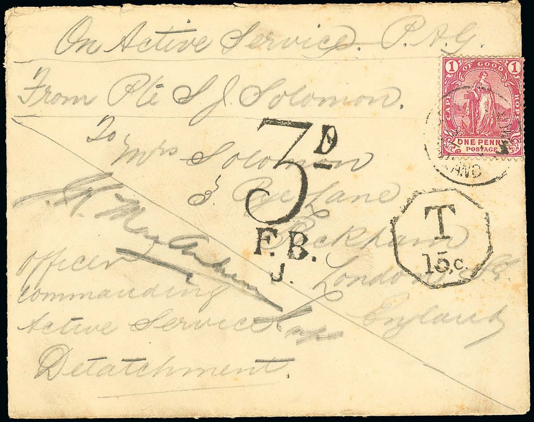 1897 soldier's envelope "On Active Service From Pte. S.J. Solomon" to England, signed by the Commanding Officer and bearing Cape 1d. cancelled by indistinct Kuruman c.d.s., charged postage due on arrival with "t/15,c." and "3d/f.b./j." handstamps, no arrival c.d.s. Photo