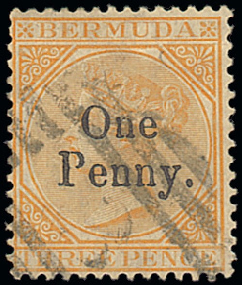 — "One Penny" on 3d. yellow-buff cancelled by large part "3" in oval of bars at Ireland Island; trace of a crease at top, otherwise fine and "One Penny" on 1/- green with variety round "O" in "One", well-centred and lightly cancelled; a little soiled at foot. Scarce. R.P.S. Certificate (1958) for both. S.G. 16, 17, £550. Photo
