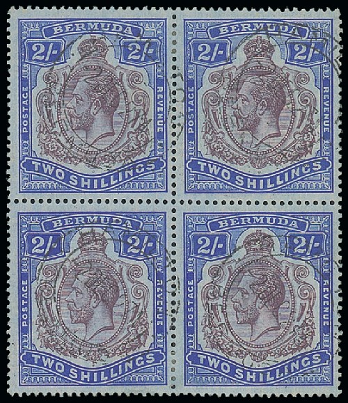 1918-22 2/- purple and blue on blue block of four with each neatly cancelled by Hamilton double-ring datestamp of 2 December 1927; fine and scarce. S.G. 51b. Photo