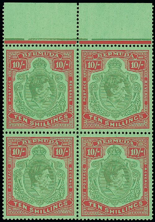 10/- yellowish-green and deep carmine on green, 4th. printing marginal block of four, [9-22] with HPF10a, 21e, 22b, fresh lightly mounted mint. Rare with only 85 sheets printed. Photo