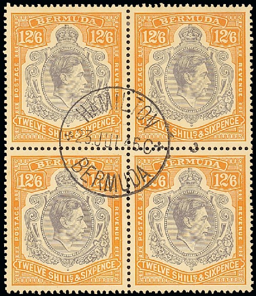 12/6d. grey and brownish orange, 2nd./3rd. printings block of four, [1-14] with HPF1a, central Hamilton 1946 c.d.s.; fine. Photo