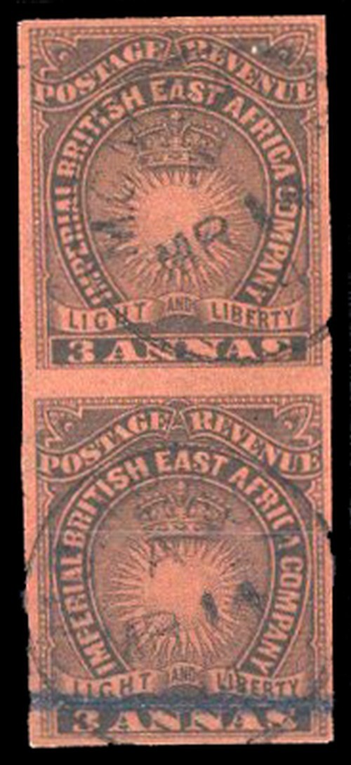1890-95 3a. black on dull red, pairs (3), variety imperforate (vertical), imperforate between horizontal and vertical all with Mombasa cancellations, the second and third on pieces; good to fine. S.G. 8ab, 8ac, 8ad, £1,225