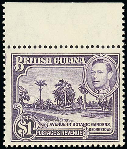 1938-52 $1 bright violet, perf. 14 x 13, marginal from the top of the sheet, unmounted mint hinged in the margin only, fine. S.G. 317a, £500. Photo