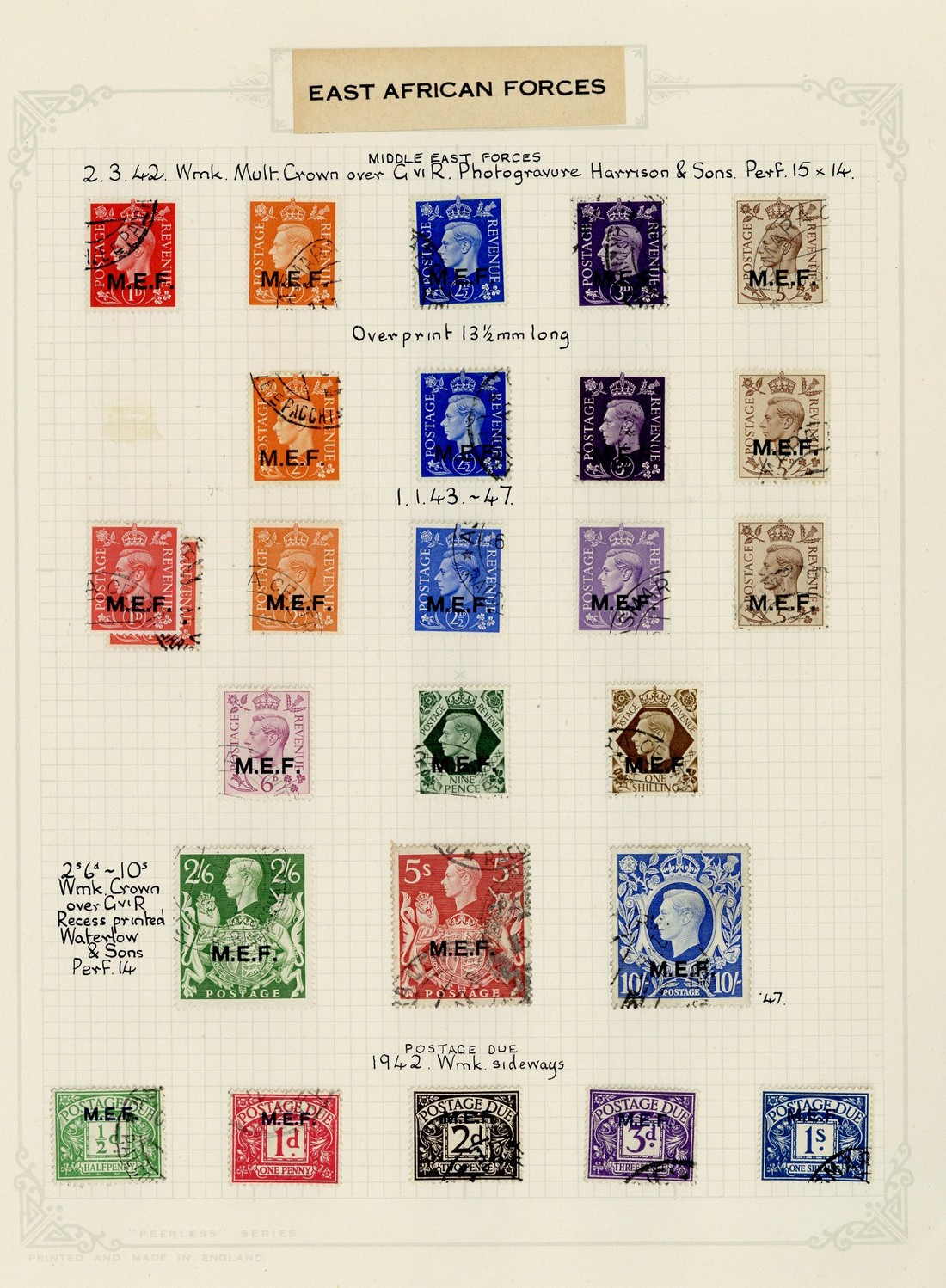1942 regular lettering set of five with 14mm. overprint and 2d. to 5d. with 13½mm. overprint, 1943-47 set and Postage Due set of five, fine used. Cat. £424