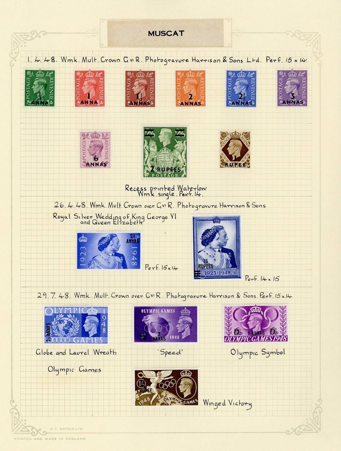 1948-61 mint collection with the basic issues complete and with additional 1955-60 2r. on 2/6d. Types II and III and 5r. on 5/- Type II; also Abu Dhabi 1964 and 1965 sets mint. Fine. Cat. £477