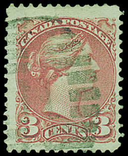 1870 (Feb.) 3c. Indian red perforated 12½, neatly cancelled with part "h" in oval of bars; an attractive example of this scarce perforation variety. R.P.S. Certificate (1949). S.G. 79a, £700. Photo