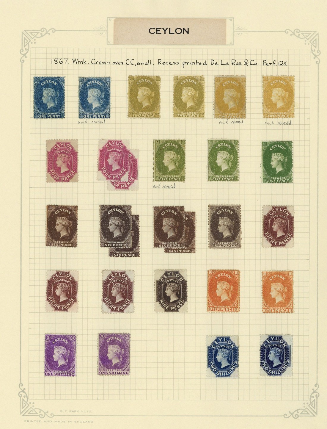 — 1d. (2, one with watermark reversed), 2d. bistre (2), 2d. yellow (2, both with watermark reversed), 4d. (3), 5d. (3, one with watermark reversed), 6d. (6), 8d. (3), 9d., 10d. (2), 1/- (2) and 2/- (2), shades, unused with part to large part original gum; generally good to fine