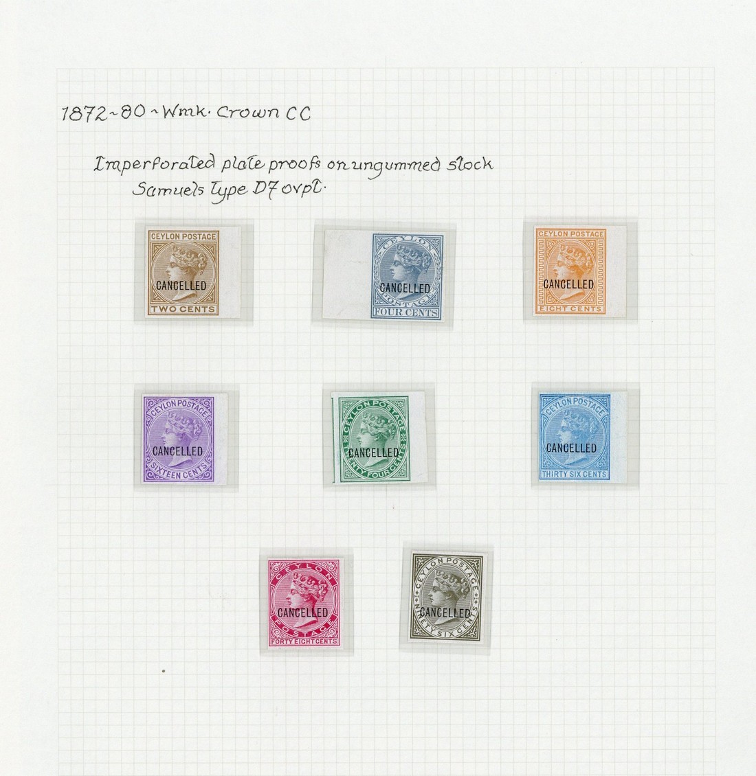 2c., 4c., 8c., 16c., 24c., 36c., 48c. and 96c., all in near to issued colours on glazed card (some marginal), each overprinted "cancelled" (D7)