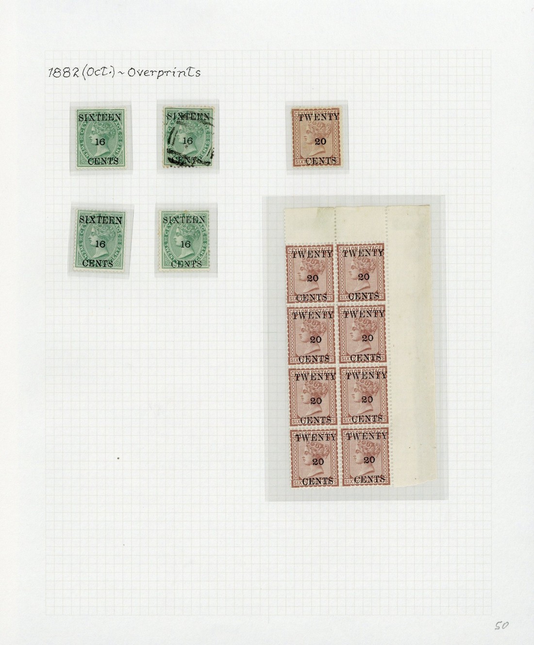 1882 16c. on 24c. (4, one used) and 20c. on 64c. (9 with a mint corner block of eight); 1883-98 selection with 2c. green (2) and 8c. (2) mint blocks of four, 4c. rose with forged trial perf. 12 and unissued 24c. brown-purple (no gum) overprinted "specimen"