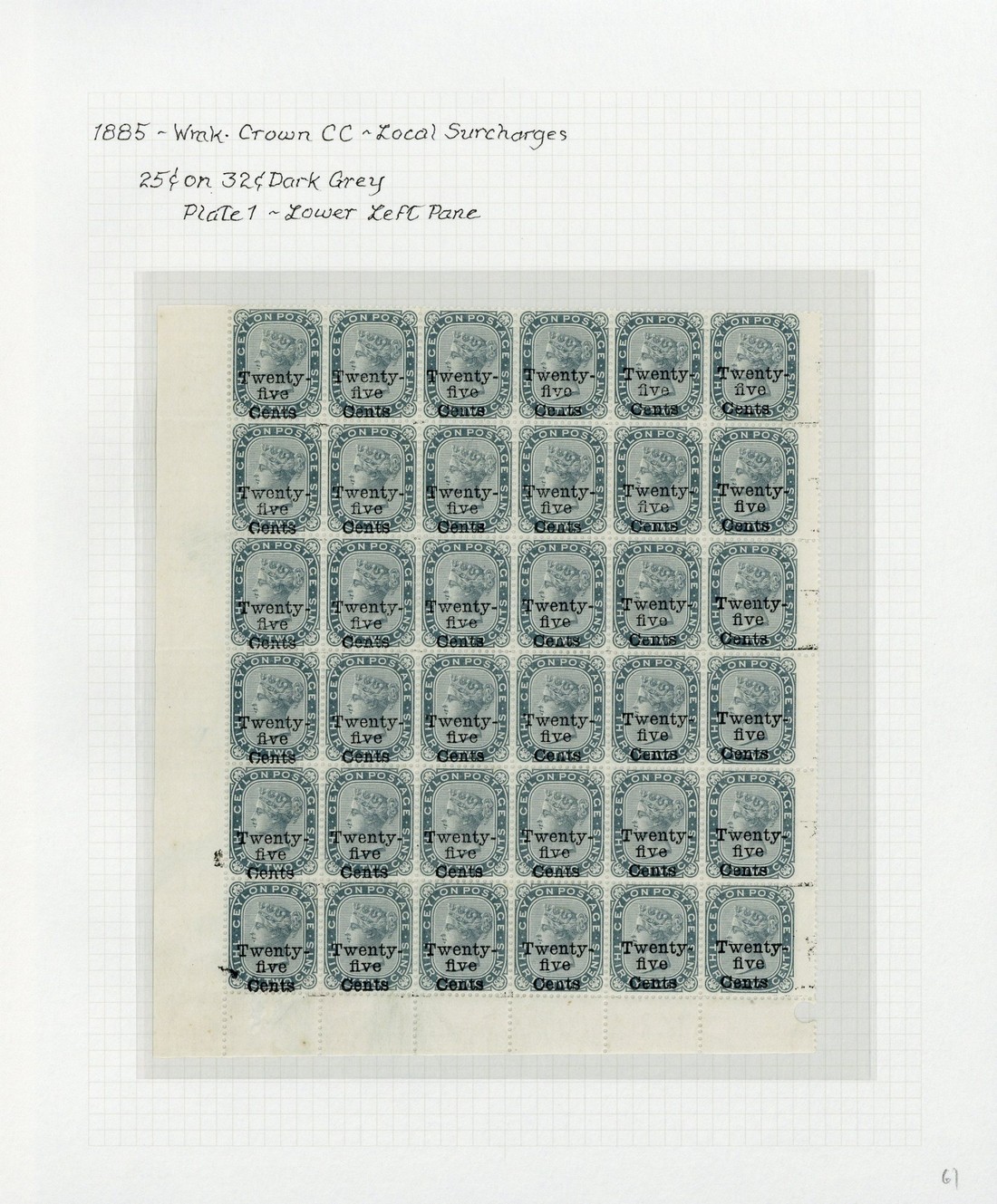 Watermark CC, perf. 14, 25c. on 32c. lower left and lower right wing-margin blocks of thirty-six from the foot of the pane, fresh mint with many unmounted. S.G. 167, £1,800