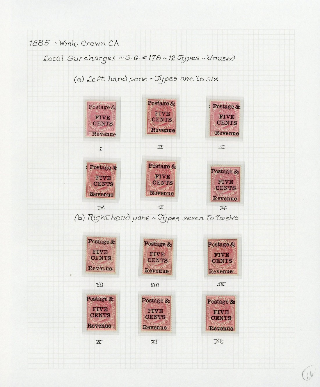 Watermark CA, perf. 14 5c. on 4c. unused and used and 5c. on 16c., twelve examples of each identified as the complete setting types, the unused mostly with part gum, the used variously cancelled; fair to fine. S.G. 178, 180, £576