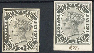 — 5c. stamp-size die proofs (2) dated "20/8/85" and "8/4/91" in pencil on reverse, one initialled "G.N." at foot in ink