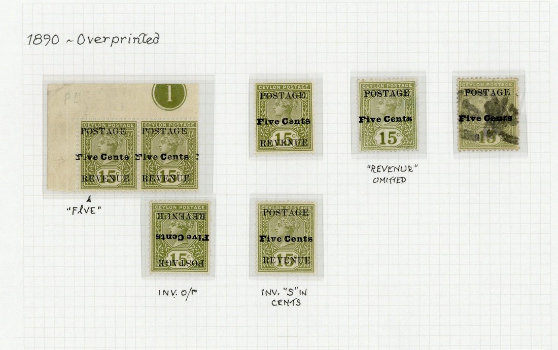 1890 5c. on 15c. olive-green (7), comprising normal and varieties surcharge inverted, "Flve" for "Five" in corner plate number pair with normal, "revenue" omitted (2, one used, fair) and inverted "s" in "cents", good to fine mint. S.G. 213, £700+