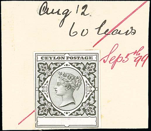 1899-1900 1r.50/2r.25 master die proof, stamp-size in black on glazed card affixed to De La Rue day book piece marked "Aug 12 60 leads" and, in red ink, "Sep 5th. 99". Photo