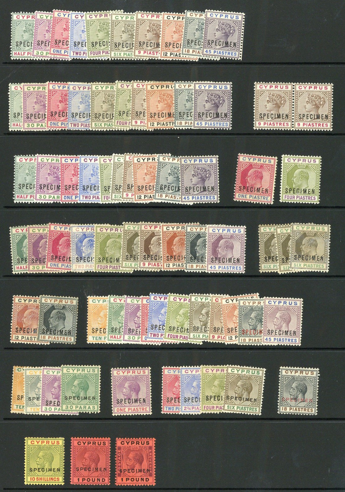 1894-1946 selection (150) including 1894-96 ½pi. to 45pi., 1902-04 ½pi. to 45pi., 1912-15 10pa. to 45pi., 1921-23 10/- and £1, 1928 50th Anniversary set, 1937 Coronation set and 1938-51 ¼pi. to £1, each overprinted or perforated "specimen", large part original gum; a few minor faults, otherwise fresh and fine. S.G. between 40s and 165s, £3,640