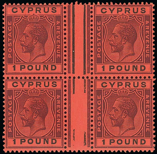1924 £1 purple and black on red block of four with vertical gutter margin between, unmounted mint; fresh colour, fine and rare. S.G. 102, £1,200+. Photo