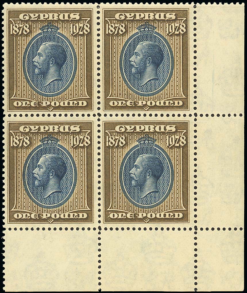 1928 British Rule set in unmounted mint blocks of four, the top four values from the corners of the sheet (45pi. hinged in the margin); gum very slightly toned as usual, fine and fresh. S.G. 123-132, £1,200+. Photo