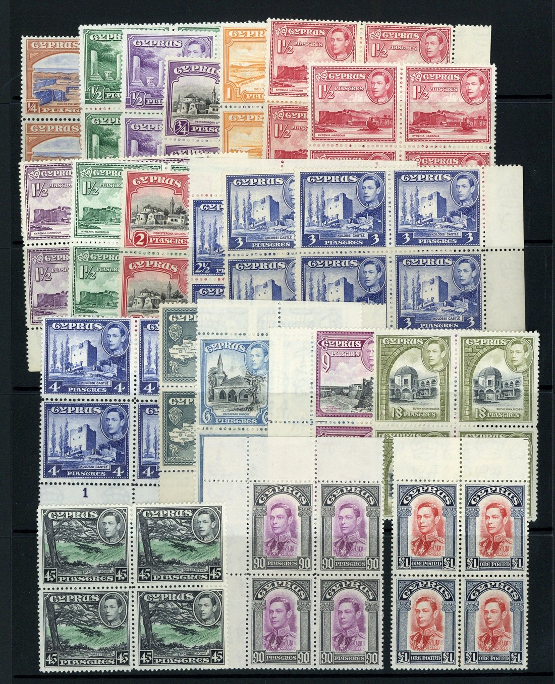 1938-51 ¼pi. to £1 set of nineteen with an additional 3pi., all in blocks of four, mostly marginal or corner with some to 4pi. showing plate numbers including 3p. with numbers "1" and "2", and additional 1½pi. carmine block of four with one stamp showing partly covered "T" guide mark, unmounted mint. S.G. 151-163, £1,037+