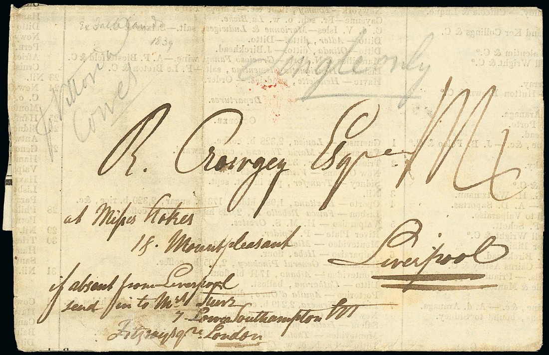 1839 (2 Nov.) Rio de Janeiro Prices Current, possibly written from there or elsewhere, to Liverpool with a direction that if not there to be forwarded to London, rated "1/4" and showing, on reverse, Liverpool and London datestamps together with reverse step-type "ship letter/cowes" handstamp across join; the interesting contents with reference to the idea of setting up Penal Settlements in the islands, comment on the number of islands and the hope that convicts could be sent to the larger islands after exemplary conduct, and a note regarding the late Falkland Islands Land Governor Mr. Lowcay; one of the panels missing though a fascinating letter. Photo