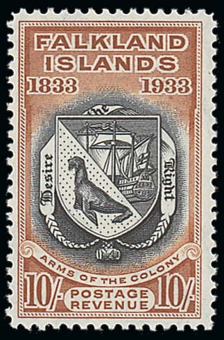 — 10/- black and chestnut, mint; fresh appearance, brown hinge mark on gum, otherwise fine. S.G. 137, £800. Photo