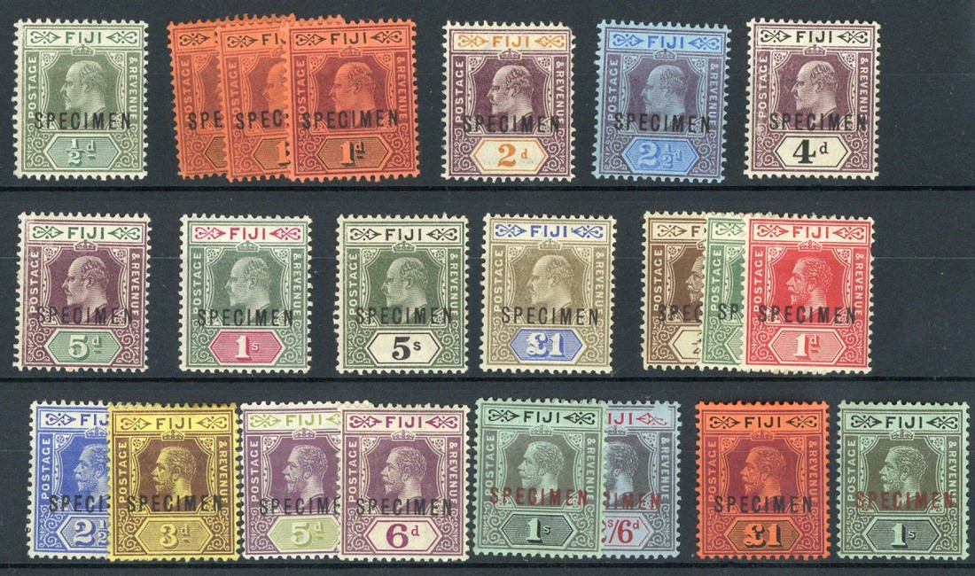 1903-46 selection (35) comprising 1903 ½d. to £1 less 3d. and 6d., additional 1d. (2), 1912-23 ¼d. to £1 less 2d., 4d. and 5/-, additional 1/-, 1938-55 ½d. to 5/- less 2d. green and magenta, 2½d., 1/5d., 5/-, 10/- and £1, and 1946 Victory set, all overprinted or perforated "specimen", large part original gum to unmounted mint,; a few minor faults, generally fresh and fine. S.G. between 104s and 269s