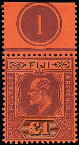 1904-09 ½d., 1d. and 1/-, 1906-12 ½d. to £1, unmounted mint from the tops of the sheets and all with plate numbers (a few hinged in the margin); the first 1/- a little stained, otherwise fresh colours and an exceptional set. S.G. 115-124. Photo