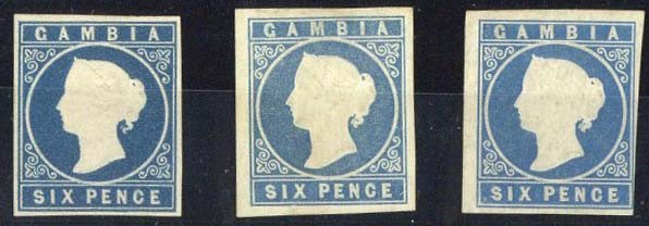 1869-72 no watermark 6d., three shades, one with small margins, one with large margins and one with large margins nearly all round, frame shaved partially on one side, unused or with part gum; one with a little split embossing, otherwise sound. S.G. 3, 3a, £1,700