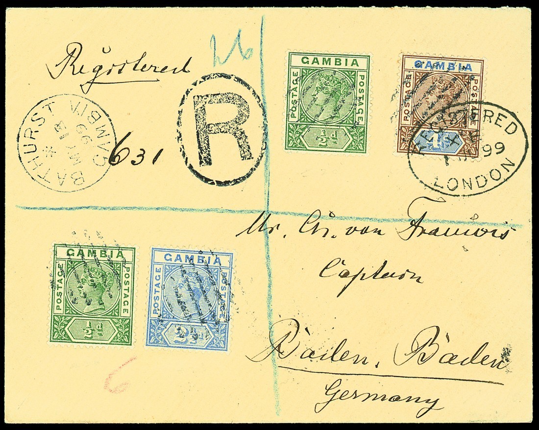 1899 (13 May) envelope registered to Baden-Baden, bearing 1898-1902 ½d. (2), 2½d. and 4d. tied by oval of seven bars, London (1.6) transit datestamp additionally ties the 4d., arrival c.d.s. (3.6) on reverse; fine. S.G. 37, 40, 42