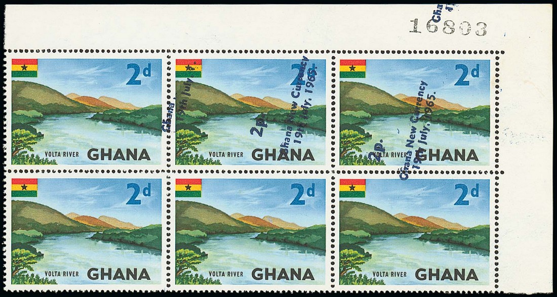 2p. on 2d. top right corner block of six (3x2) with sheet number "16803", showing scarce indigo surcharge dramatically misplaced almost upright resulting in two without surcharge and one with albino surcharge, fine unmounted mint. S.G. 382g var. Photo