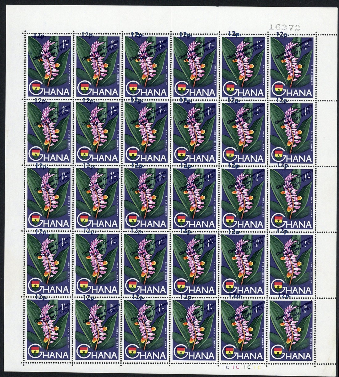 12p. on 1/-, two complete unmounted mint sheets (5x6), one with blue surcharge misplaced upwards, the other with black surcharge misplaced to left, fine. S.G. 387, 387c; £397+