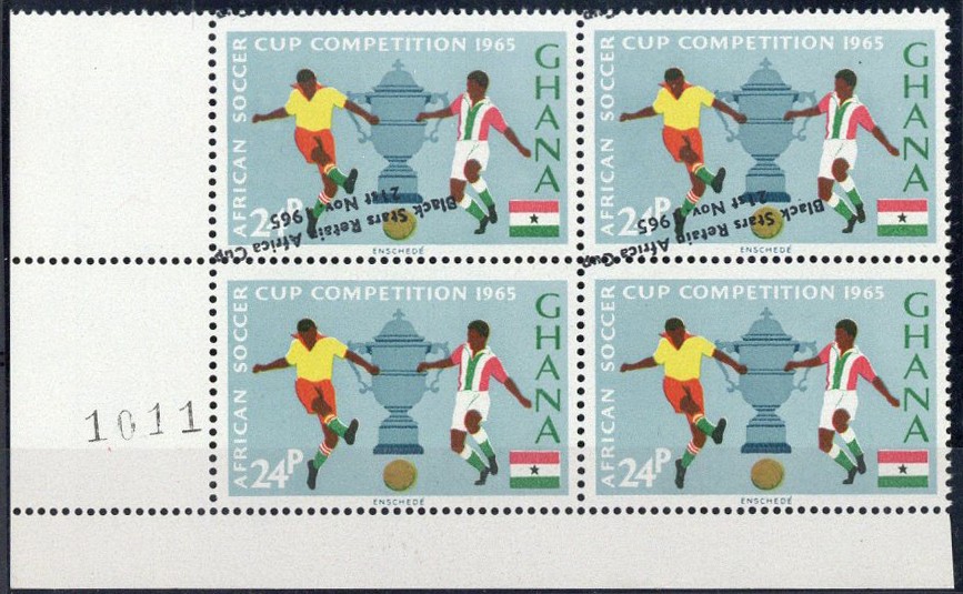 1966 (Feb.) "Black Stars" Victory, 24p. lower left corner block of four showing sheet number "1011", variety upper pair with overprint inverted, the lower pair without overprint (just impinges on perf tips of both at top left, fine unmounted mint. S.G. 414ab, £340