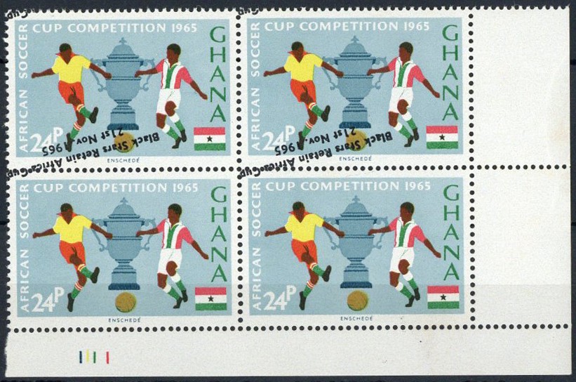 — 24p. lower right corner block of four showing sheet plate numbers, variety upper pair with overprint inverted, the lower pair without overprint (just impinges on perf tips of both at top left, fine unmounted mint. S.G. 414ab, £340