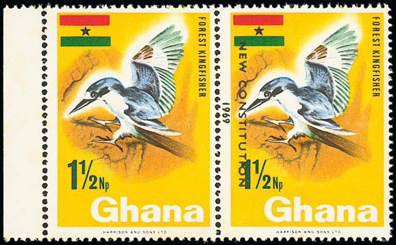 — 1½np. horizontal pair with margin at left, variety overprint vertical down on right stamp and omitted on left stamp, fine unmounted mint. S.G. 542ba var. Photo