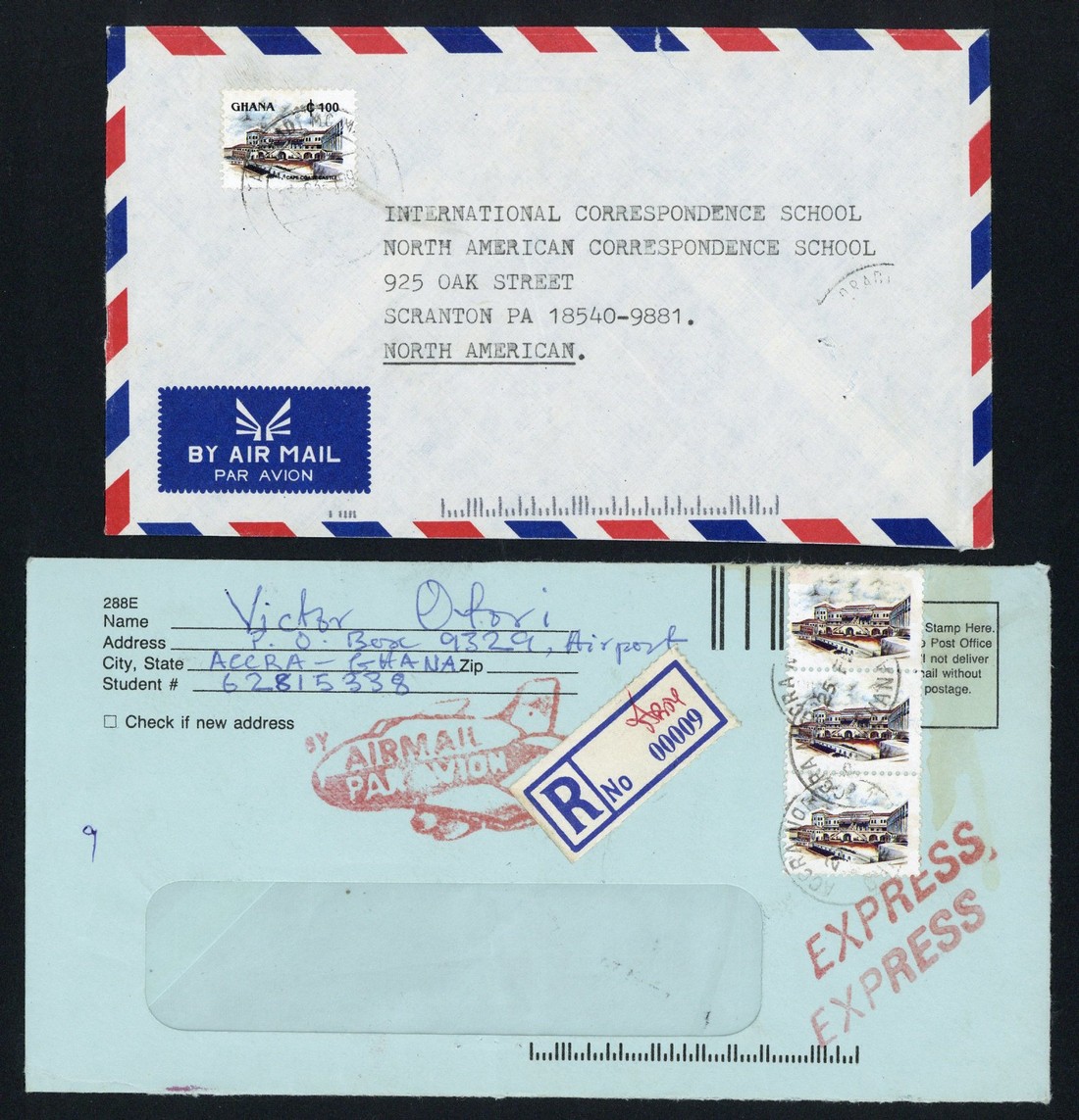 1991 (21 Nov.) Definitive 100c. vertical strip of three, variety black (inscriptions) omitted, tied by Accra North c.d.s. on commercial registered and express window envelope; the strip slightly soiled at top and with some shortish perfs at right. S.G. 1643a, unpriced. Photo