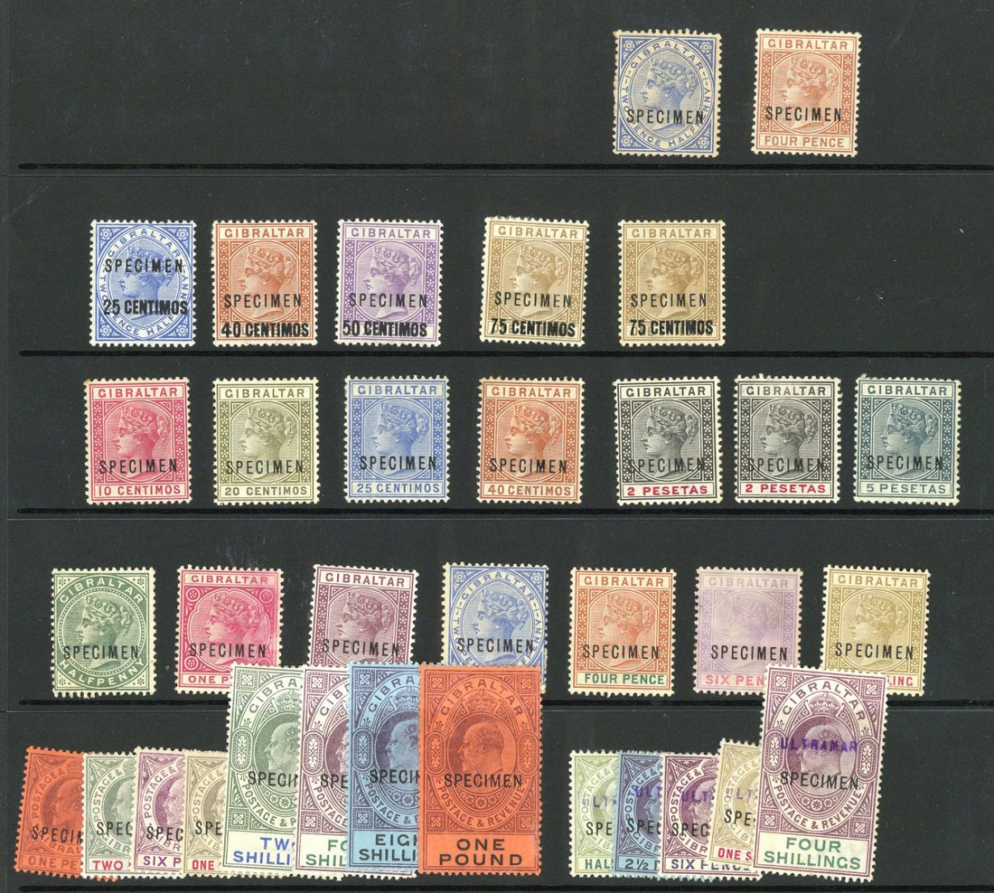 1886-1951 selection (62) including 1903 set to £1 less ½d. and 2½d., 1903 values (5) to 4/- each handstamped "ultramar", 1906-11 values (6) to 8/-, 1912-24 ½d. to £1 and 1938-51 2d. carmine vertical strip of three from the top of the sheet, each overprinted or perforated "specimen", a few faults, generally good to fine. S.G. between 11s and 124cs. Photo