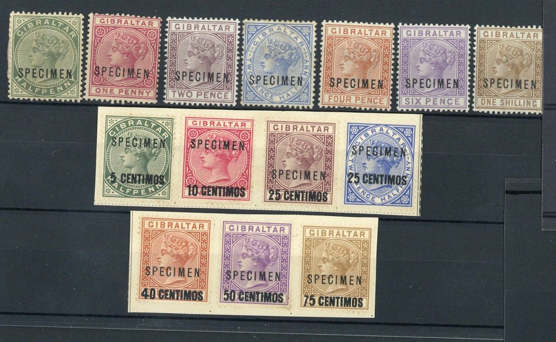 1886-98 selection (32) comprising 1886-87 ½d. to 1/-, 1889 Surcharges (affixed to two pieces), 1889-96 5c. to 5p., 1898 ½d. to 1/- (all without gum), each overprinted "specimen", part to large part original gum, generally fine. S.G. 8s-45s, £1,600