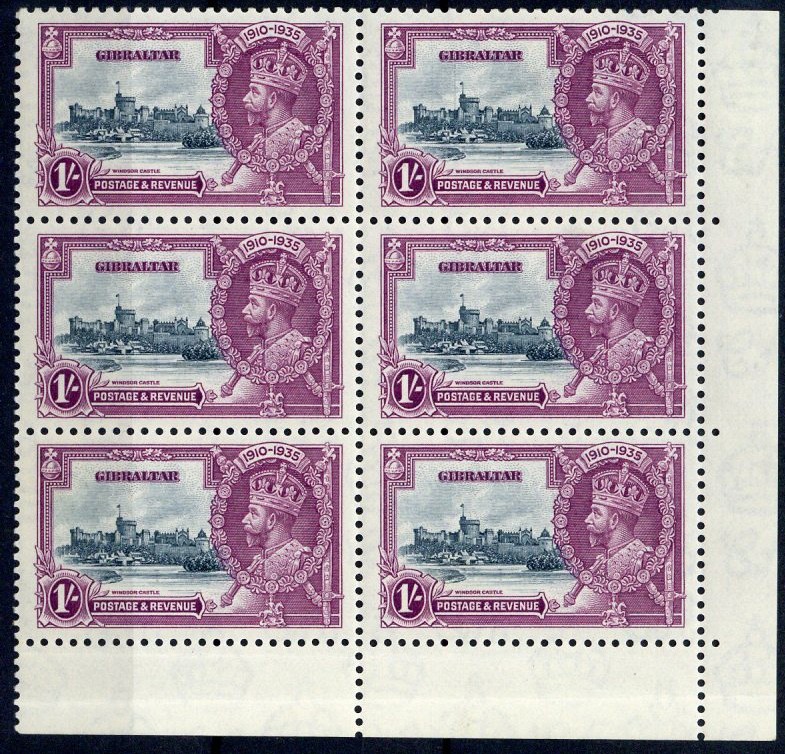 1935 Silver Jubilee 1/- lower right corner block of six (2x3) from Plate 2, the upper right stamp showing variety hairlines to the left of the round tower, large part original gum. S.G. 117
