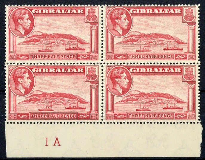 1938-51 1½d. carmine perf. 14 marginal block of four with plate number "1A", unmounted mint with the usual lightly toned gum. S.G. 123