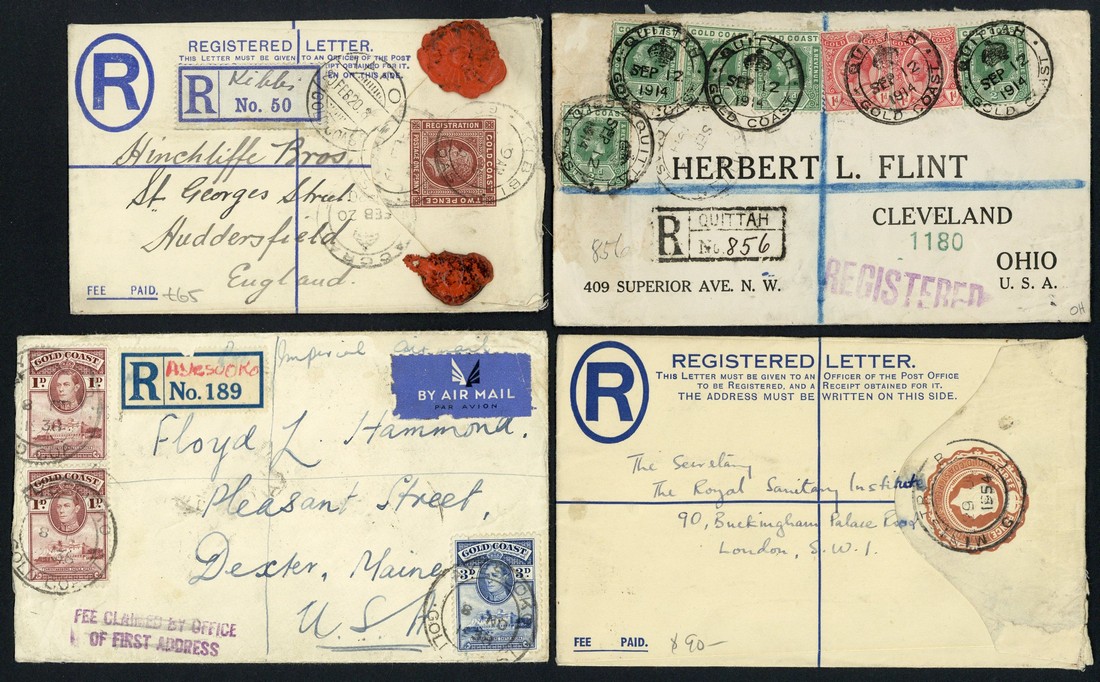 1906-57 envelopes (35, eight registered), stationery aerogramme, cards (4), registered envelopes (22), picture postcards (2), reply half of GB reply paid card, telegrams (4) and telegram envelopes (3), mostly KGVI and QE with a good range of village cancels, a few Officials and some with tax markings. An interesting lot worth careful viewing