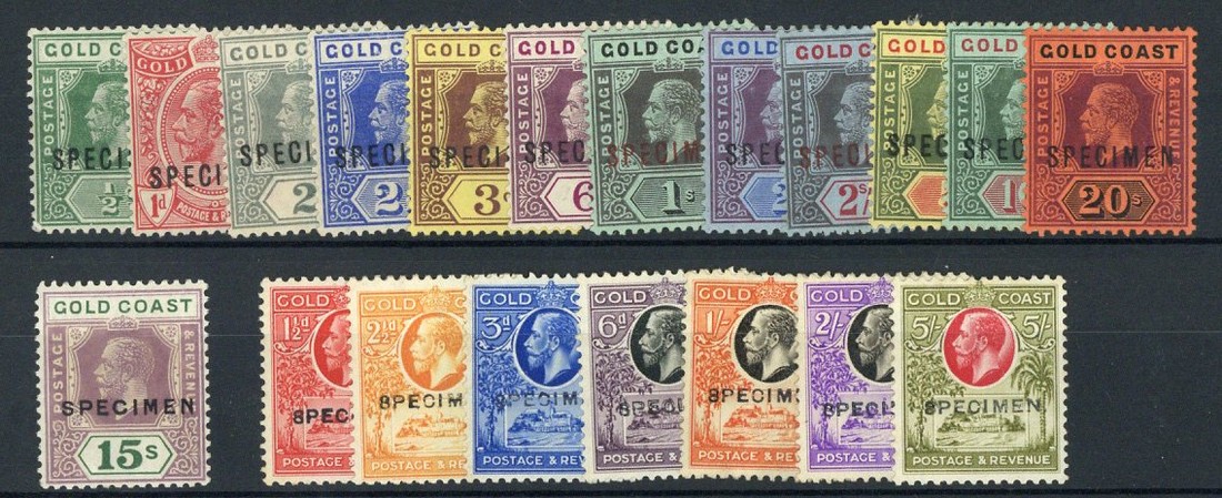 1913-21 ½d. to 20/-, 1921-24 15/- dull purple and green, 1928 values (7) up to 5/- each overprinted "specimen" (D12, D16 and H2), large part original gum, fresh and fine. S.G. between 71s and 112s, £410+