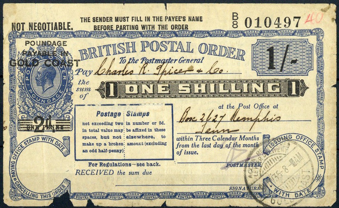 1935 GB 1/- Postal Order overprinted "gold coast", cancelled by "accra registered/letter delivery/gold coast" c.d.s. (Proud Type R13); some small peripheral faults though scarce