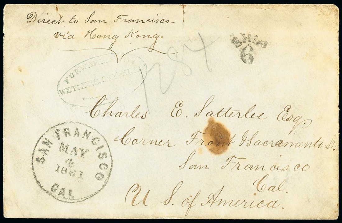 1861 (19 Feb.) stampless envelope (with enclosure) from Shanghai to San Francisco, endorsed "Direct to San Francisco via Hong Kong" and showing, on reverse, red forwarding agents' cachets of Wetmore, Cryder & Co., Shanghai and Koopmanschap & Rosman, Hong Kong and, on address side, Wetmore, Cryder & Co. oval in black (none recorded by Rowe), "ship/6" handstamp and San Francisco arrival datestamp (4.5); some minor soiling though a very remarkable cover with these three forwarding agents' cachets. Photo